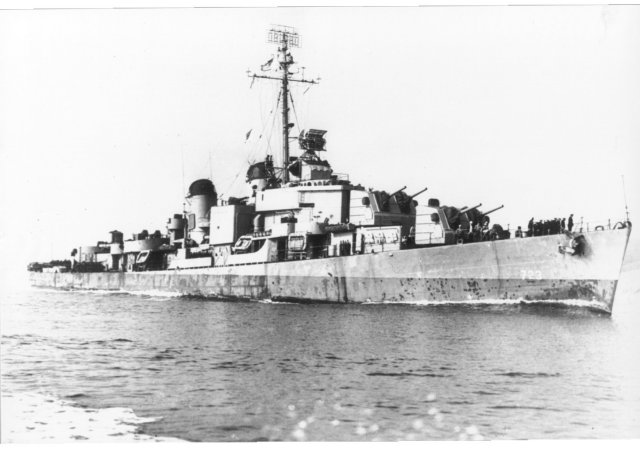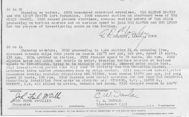 2215 completed investigation commenced forming cruising disposition ONE VICTOR, base course 155T and pgc, 165 pgc. Speed 15 knots, 138 rpm. 2300 Captain held burial services for men from USS Underhill tentatively identified from marks on clothing as: HIGGINS, E. H., SMITH E., BURKETT, R. E. all killed in action, details not known.