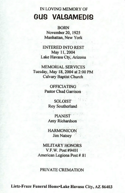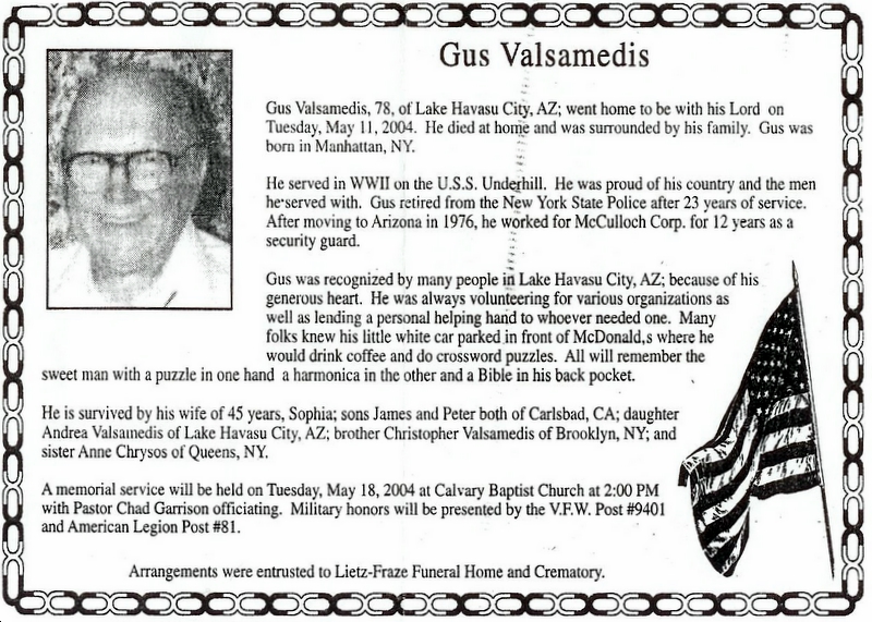 I recently received a letter from Andrea Valsamedis about the death of her father. Gus Valsmedia passed away on Tuesday May 11, 2004. Gus was a Seaman 1/C Gunnersmate. Andrea does not have access to a computer but wanted to pass along this information about her father and we sincerely appreciate that.